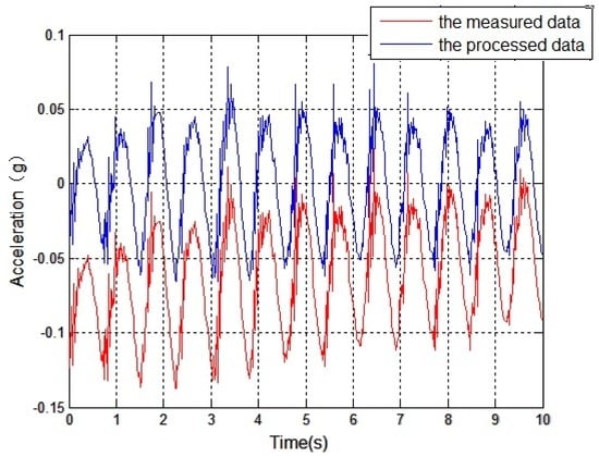 During the data collection process of the sensors, due to temperature drift and outside interference, the received signals often contain DC components and trend items, whose existence have a large influence on the subsequent integral operations, and may even yield distortions. Therefore, the mean method and the least squares method are used to remove the DC components and the trend items. Figure 12 compares a set of measured data, of which the data contain the DC component and the trend items are represented by the red line, and the processed data are represented by the blue line. This shows that the processing effect is good.