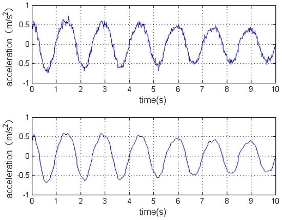 Selecting acceleration data of one direction in the reciprocating trial in one period as an example, Figure 13 illustrates the effect of low-pass filtering. The first plot is the waveform simulation of the original measured acceleration, and the second plot shows the signal after low pass filtering. The original measured acceleration signal showing high frequency interference get smoother after low-pass filtering, which makes the acquired data more accurate and easier to use for subsequent processing.