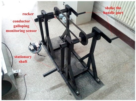An experiment setup was built to test the feasibility of the monitoring sensors, as illustrated in Figure 16. One end of the conductor is fixed, and the other end is fixed on the handle of a machine. The machine can excite the conductor to perform an elliptical motion in one direction by driving the handle vibration. A microwave radar meter is used as benchmark for measuring the length of the semi-major axis and semi-minor axis []. The collected data of the tri-axial accelerations and angular rates are sent to a computer with a software installed especially for the test using ZigBee. Then the relative displacement curves were obtained through fitting.