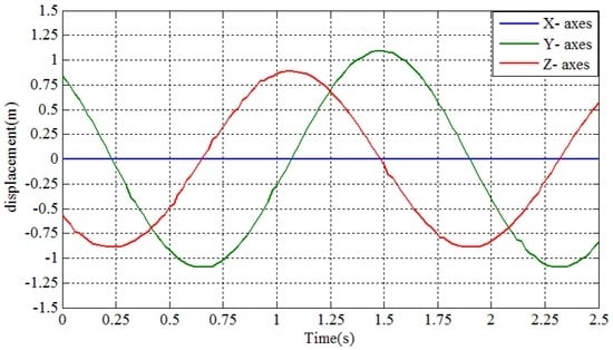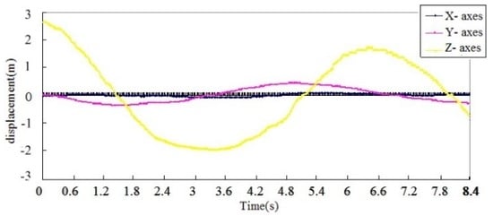 A test platform, as shown in Figure 14, was built to test the measuring accuracy of the proposed conductor galloping sensor. The conductor galloping sensor was installed on the test equipment with the X-axis parallel to the fixed axis and the Z-axis perpendicular to the ground. As the shaft performs a reciprocating movement, the accelerations and angular rate measured by the conductor galloping monitoring sensor were transmitted to a computer with software installed especially for the test installed by a ZigBee network. After being processed, the results of the displacements along the X-, Y- and Z-axes are shown in Figure 15. In addition, the known biggest swing amplitude is 1 m.