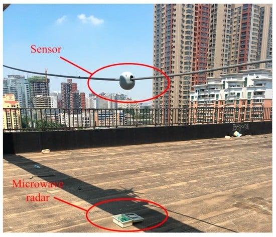 The wireless sensor module has been tested in the Guizhou power grid. Three sensors were installed on a conductor spanning 734 m. The field installation is shown in Figure 18.