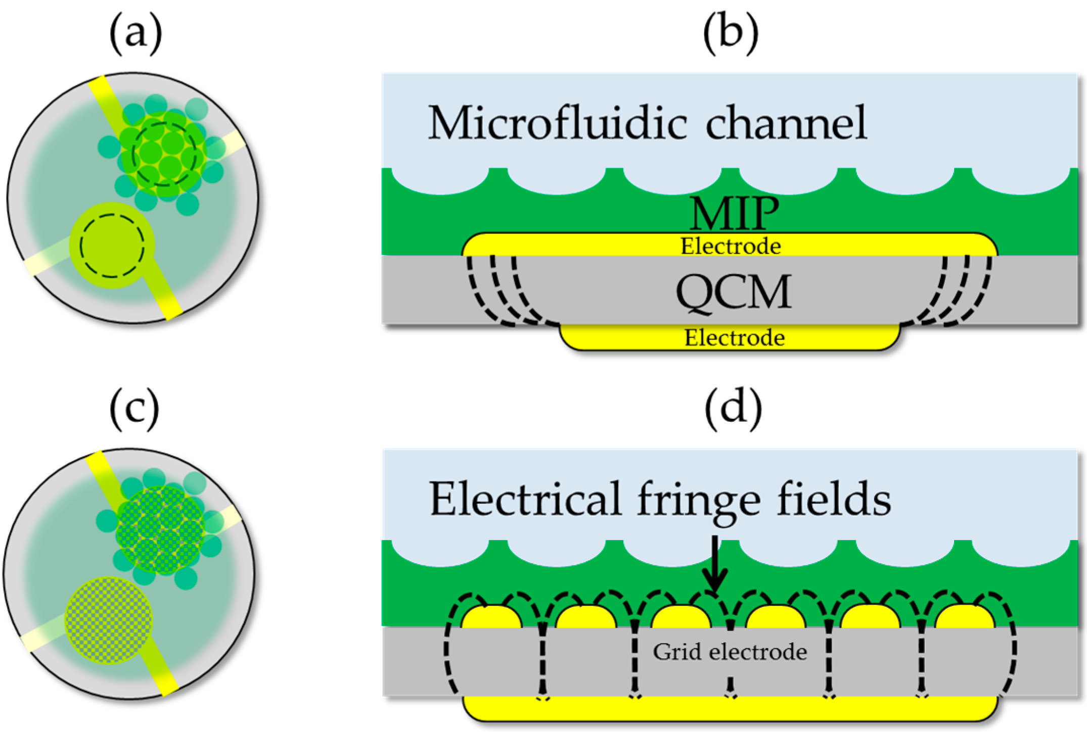 Figure 2c, the QCM can become very sensitive for ionic effects. The electric field penetrates via the grid into the MIP layer where the pits can be empty or filled with yeast cells. With an appropriately thin polymer layer, the electrical interference from the fringe fields can now be used to probe the viability of cells.