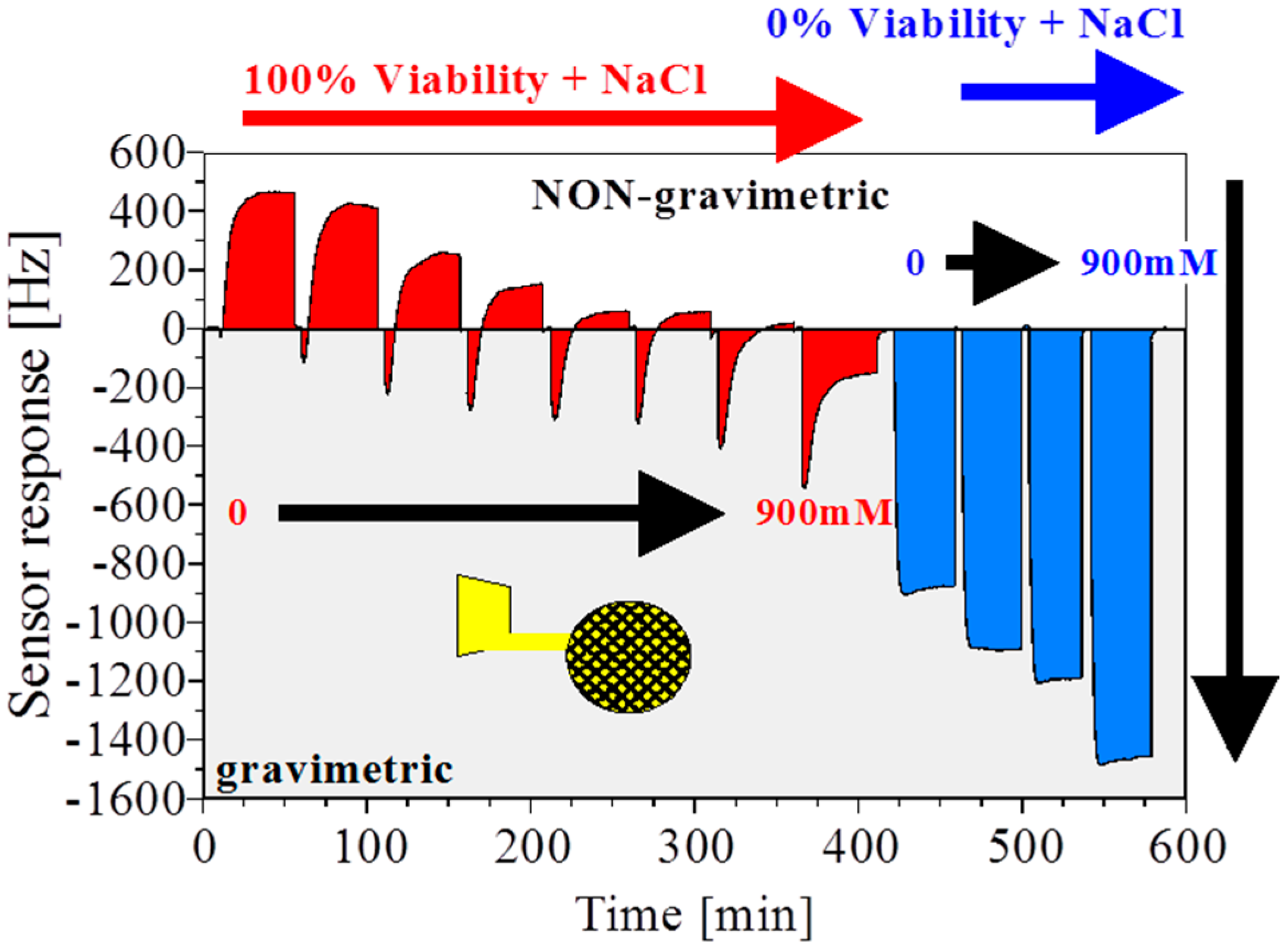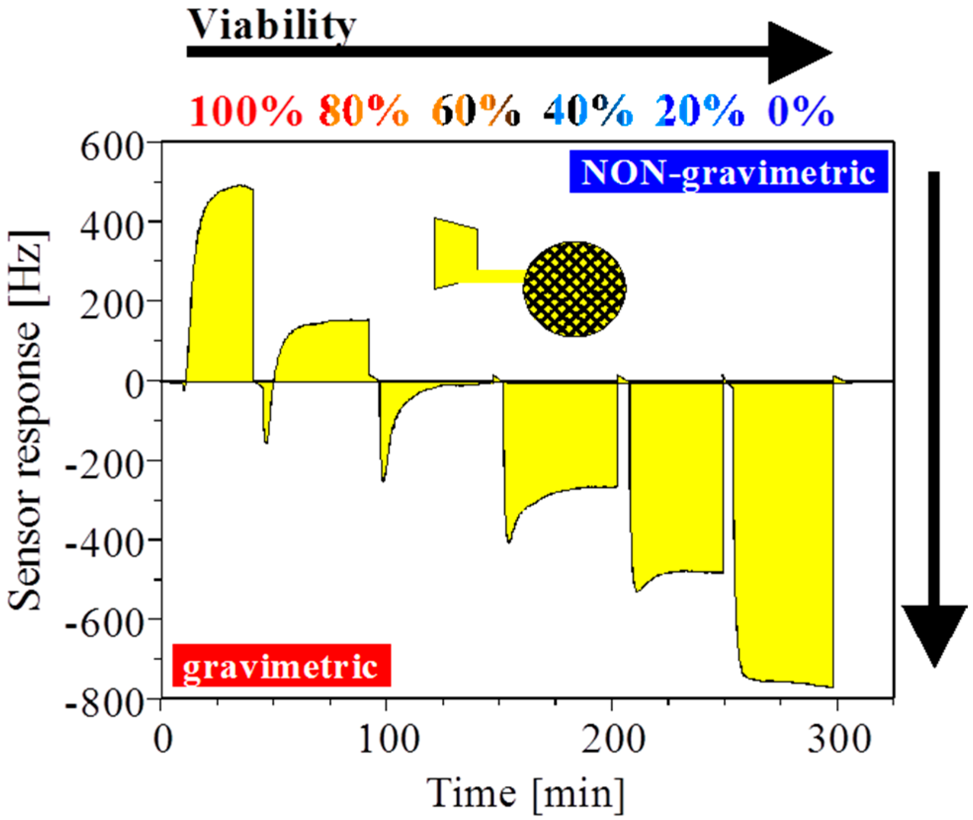 7 cells/mL has a grid structure. With this experimental setting we can observe that the massive gravimetric effect cannot be observed anymore for both viable and non-viable yeast cells. The eight-fold diminished sensitivity is the result of the reduced metallized electrode area. Second, the sensor response is inverted and non-gravimetric responses dominate a cell suspension with >60% viability. Viable cells with integral membranes have a high capacitance and the interior conductivity differs from non-viable cells [