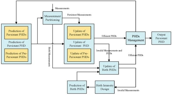 If a pre-persistent PHD has a large enough weight, such as , it can be reclassified as a persistent PHD. Then, the persistent PHD set is augmented by in the pre-persistent PHD set .