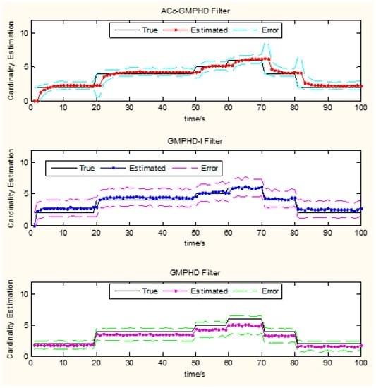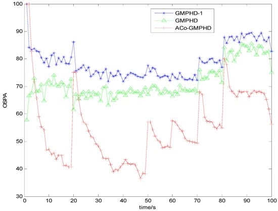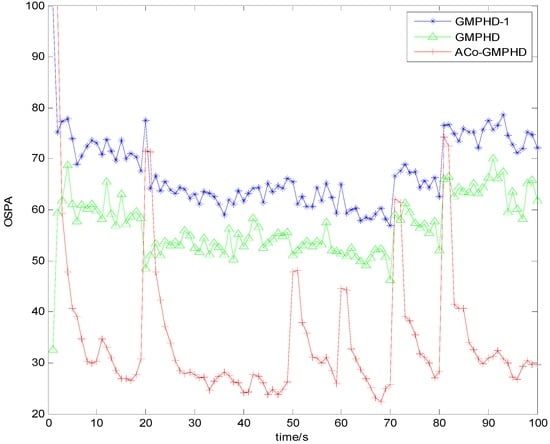 As shown in Figure 3 and Figure 4, there are five OSPA peaks in the ACo-GMPHD at times 20, 50, 60, 70, and 80 s, corresponding to the target appearances and disappearances, respectively. Some peaks are even higher than that of the standard GMPHD, and are always smaller than that of the GMPHD-I. The explanation for this is that:
