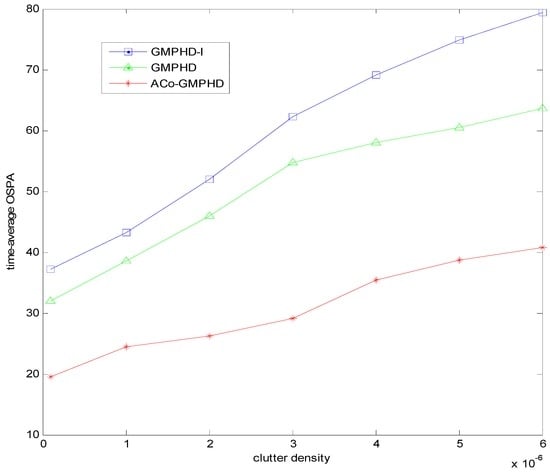 Furthermore, we present the time-averaged OSPA versus the clutter density in Figure 6. With the increase of clutter density, the OSPA distance of the ACo-GMPHD filter gradually increases, but it is still lower than that of other two comparison algorithms.