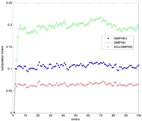 For each time step, the averaged computation time (ACT) is shown in Figure 7. Obviously, the ACo-GMPHD filter significantly decreased the computational burden, compared with the standard PHD or GMPHD-I filters. The ACT of the ACo-GMPHD filter is about 0.65 s, much smaller than the measurement sampling period of 1 s.