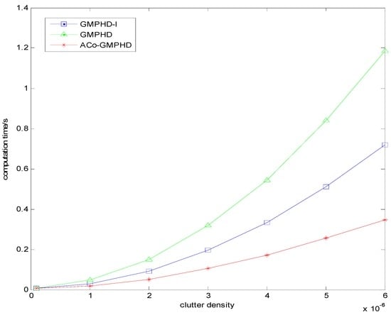Figure 8 plots the curves of the ACT versus the clutter density. As the clutter density increases, the ACTs of all the filters increase; however, the ACo-GMPHD filter has the lowest rate of increase, implying that it is more suitable for the dense clutter case.