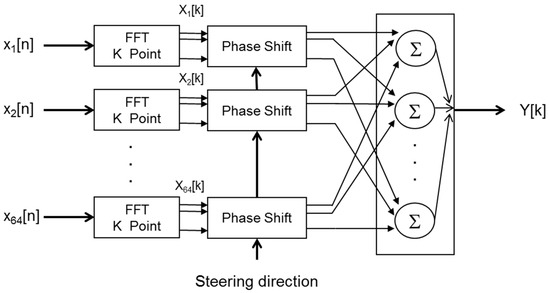 Finally, in the image generation block, based on wideband beamforming, a set of N × N steering directions are defined, and the beam former output are assessed for each of these steering directions. Wideband beamforming [3] computes the FFT of the MEMS signals xi[n]; multiplies, element by element, each FFT Xi[k] by a phase vector, that depends on the steering direction and the sensor position; and finally takes the sum of the FFT shifted in phase, as shown in Figure 5. The images generated are then displayed and stored in the system.