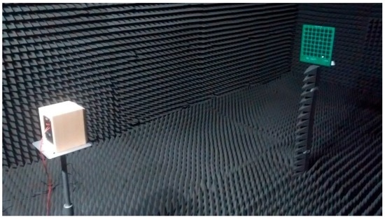 An analysis of the frequency response of all MEMS microphones included in the array was performed. A sinusoidal 4 ms pulse, with a frequency changing between 2 and 18 kHz, was generated using a reference loudspeaker. Previously, the frequency response of the reference loudspeaker was calibrated using a measurement microphone (Behringer ECM 8000) and placing it in the same position as the array. Figure 6 shows the arrangement of the components used to perform this analysis. All measurements were performed in an anechoic chamber.