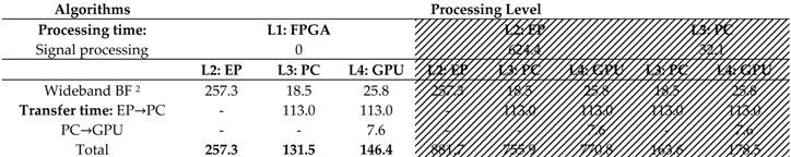 Depending on the level where the signal processing algorithm runs, there are three implementation options. In turn, for each of these possibilities, there are up to three options depending on where the wideband beamforming algorithm is implemented. Table 5 summarizes the different options to implement the acoustic imaging algorithms with their corresponding processing and transfer times for all feasible processing levels.
