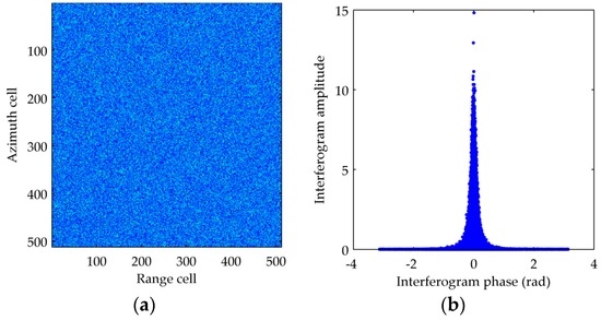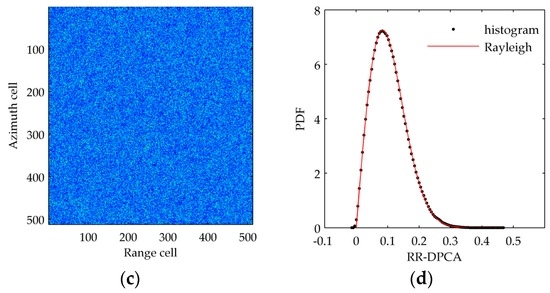 Next we will use simulated data to demonstrate the effectiveness of Equations (10) and (11). Firstly, the homogenous clutter of two channels are generated based on Doppler distributed clutter (DDC) model [29], and the mean value and variance of in-phase and quadrature components of clutter is zero and , respectively. Figure 1a shows the simulated clutter amplitude of 1th channel with the size of 512 × 512 pixels. It can be calculated that the correlation coefficient magnitude between the two channels’ clutter is 0.9945. The relationship between interferogram amplitude and phase is given in Figure 1b, which satisfies the property verified in [13]. The RR-DPCA outputs of the simulated data can be obtained as Equation (6), and the size of window to calculate the multi-look image is 9 × 9. The RR-DPCA image is shown in Figure 1c, and its histogram and the estimated Rayleigh PDF are shown in Figure 1d. It can be found that the statistics of RR-DPCA fits Rayleigh distribution very well. Furthermore, in Table 1 the theoretical and measured mean values and variances of the original clutter, DPCA outputs and RR-DPCA outputs are given, respectively. It is shown that all the errors of them are small, therefore, in the homogeneous clutter background the CA-CFAR can be implemented for the RR-DPCA based on Rayleigh distribution. It is worth mentioning that, this paper only discussed the RR-DPCA statistical distribution for homogeneous clutter, but the proposed method can also be used in heterogeneous clutter. For these cases, the CFAR processing should be changed accordingly for more complicated statistical distributions.