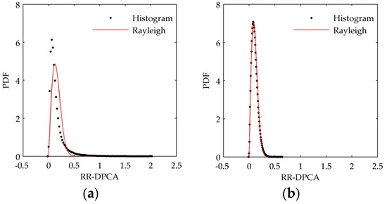 where is the correlation coefficient magnitude between the two SAR images. For Equation (6), is the expectation of the image magnitude so the denominator of Equation (6) is a constant for the homogeneous clutter in a window, therefore, the RR-DPCA of homogenous background still obey Rayleigh distribution. As the SAR image magnitude obeys Rayleigh distribution, its expectation can be expressed as