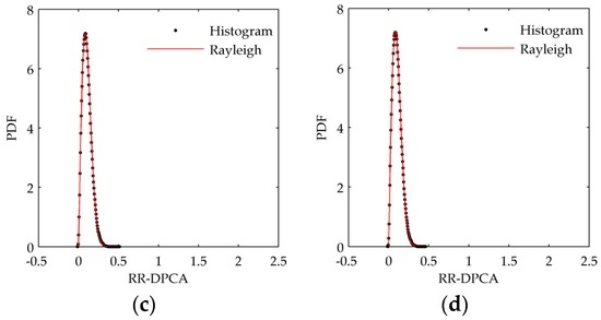 Figure 8 shows the fitting results of Rayleigh distribution for the RR-DPCA of the homogeneous area from 350 range cell to 550 range cell. The window size to calculate the multi-look image is 11 × 11. Clearly, the Rayleigh distribution can fit the RR-DPCA well for the real data. Therefore, the CFAR threshold can be calculated by Equation (4), and the CFAR results of RR-DPCA are shown in Figure 7d. It is shown the train and the weak river surface are well detected by the proposed RR-DPCA method. Furthermore, some weak point moving targets are marked with yellow circles, and the same location are marked with yellow circles in Figure 7a, it is shown that these weak point moving targets are all invisible in the original SAR image, which demonstrate the good detection performance of the proposed RR-DPCA method for weak point moving targets. Of course, as the analysis in Section 4.1.2, a point moving target with very small velocity may be not detected via RR-DPCA, while it can be detected via DPCA if it has rather high SCR. For example, the detected target marked with “T1” in Figure 7b has a velocity 0.024 m/s and SCR 33.6 dB in the original SAR image domain, whereas it is not detected in Figure 7d. However, from the same location in Figure 7a marked with “T1”, we don’t know if T1 is a moving target, its slight interferometric phase may be caused by the channel imbalance.