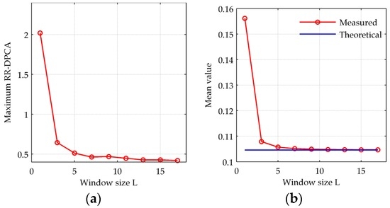 Since the multi-look image generation is a key step for the proposed RR-DPCA method as Equation (6), it is needed to analyze the influence of window size for multi-look processing. Figure 2 shows the histogram of RR-DPCA and the estimated Rayleigh PDF versus the window size. The window size L in Figure 2a–d are 1, 3, 5 and 7, respectively. When L = 1, i.e., the denominator in Equation (6) is the sum of two origin SAR images without multi-look processing, and the statistical distribution of RR-DPCA cannot fit the Rayleigh distribution at all and has serious tailing, which will aggravate the false alarm rate. When L > 1, the statistical distribution of RR-DPCA can fit the Rayleigh distribution well. As the size of window increasing, the tailing is alleviating, i.e., the clutter can be suppressed well by the RR-DPCA processing with L > 1. Furthermore, the maximal RR-DPCA value and mean RR-DPCA value versus the size of window are given in Figure 3a,b, respectively. The maximum RR-DPCA value indicates the bigger maximum RR-DPCA value is, the more serious tailing is. When L > 1, the maximum RR-DPCA value decreases quickly. When L surpass 9, it tends to be stable. The similar change tendency can be found in Figure 3b for the mean value, when L > 9, the measured mean value is extremely close to the theoretical value. Therefore, in the practice, the window size L should be larger than 1, but don’t need to be too large, and it is nice to fit the size of detected target in image domain.