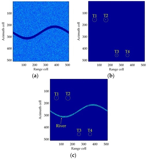 In this section, we will demonstrate the target detection performance of the proposed method based on simulated data. The system parameters are carrier frequency 10 GHz, platform velocity 120 m/s, carrier frequency 1 GHz and channel spacing 0.5 m. The clutter of two channels are generated based on DDC model, four moving targets and a river produced by simulation are added into the two SAR images. The motion parameters are given in Table 2, the four targets have the same size 4 × 4 pixels and velocity 3 m/s, while their SCR is different. A 20 pixels wide river streams from near range to the further with a velocity 1 m/s, the SCR of it is −20 dB, i.e., its intensity is far smaller than the clutter. The clutter-to-noise ratio in the whole scene is 20 dB. The 1th channel SAR image is shown in Figure 5a, it can be found that the four targets are all submerged in the clutter and invisible, while the river pixels contain no clutter and are visible. Figure 5b is the CFAR result of the DPCA, the four targets are all detected, and however the river is missing. Figure 5c shows the CFAR result of RR-DPCA. The size of window to calculate the multi-look image is 9 × 9, and the false alarm probability is set as 10−6. It is shown that both the targets and the river are detected based on RR-DPCA processing.