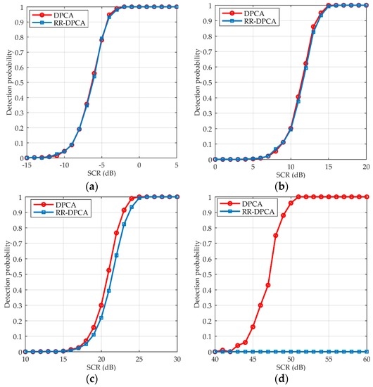In order to analyze the detection performance for point moving targets [30], the detection probability of DPCA and RR-DPCA versus SCR is shown in Figure 6. The system and clutter parameters are the same as Section 4.1.1, it can be calculated that the blind velocity is 7.2 m/s. The target size is set as 1 × 1 pixel to simulate a point moving target, and the window size to calculate the multi-look image is 9 × 9. The target’s velocity in Figure 6a–d are 3.6 m/s, 0.3 m/s, 0.1 m/s and 0.05 m/s, respectively. When SCR increases with step 1 dB, the detection probability is counted by 1000 Monte Carlo trials with Pfa = 10−6. It can be seen from Figure 6 that DPCA and RR-DPCA almost have the same detection performance when the velocity is large, even when . With the velocity further decreasing, the detection performance of RR-DPCA will be poorer than DPCA. When velocity is smaller than 0.05 m/s, the RR-DPCA cannot detect the target even if it has very high SCR, while DPCA still can detect it by the high SCR. Therefore, it can be concluded that DPCA and RR-DPCA almost have the same detection performance in the most range of velocity of point moving targets, and RR-DPCA cannot detect the target with very small velocity, e.g., vr = 0.05 m/s, no matter what SCR it has, while DPCA can detect it with a rather high requirement of SCR about 50 dB. However, in practice, so high SCR of a moving target is rare, and the minimum detectable velocity of RR-DPCA is small enough for most application scenarios.