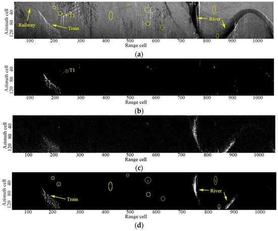 In this section, we will demonstrate the performance of the proposed RR-DPCA method by using real airborne dual-channel SAR data. The main system parameters are given as carrier frequency 9.6 GHz, bandwidth 18 MHz, sampling frequency 20 MHz, platform velocity 112 m/s, pulse repetition frequency 833 Hz and channel spacing 0.4 m. Figure 7a shows the SAR image of the 1th channel with resolution 7.5 m × 7.5 m (range × azimuth) and size of 1024 × 146 pixels. The horizontal axis and the vertical axis are the directions of range and azimuth, respectively. It can be observed that some vegetation, shrubby and strong building fields in the whole imaging scene. A railway and a defocused train can be also observed in about 200th range cell, and a river is located at the far range. The CFAR result with Pfa = 10−6 based on DPCA is shown in Figure 7b. It is shown that the train and some other point moving targets are detected. However, the river surface is missing due to its too weak amplitude. The detection result by ATI with a threshold 1.5 is shown in Figure 7c, it can be seen that although the large-sized river can be detected, the train is not clear and many false-alarms are caused in the homogeneous clutter area. Obviously, neither ATI nor DPCA can detect the point moving targets and distributed moving targets, simultaneously.