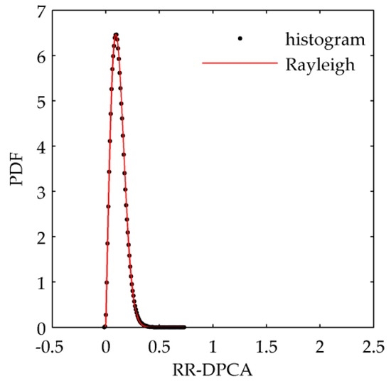 RR-DPCA histogram and estimated Rayleigh PDF of the real data.