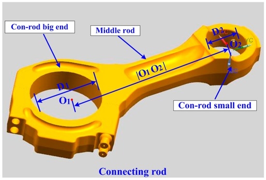 The connecting rod is a critical part inside the marine engine [19]. As shown in Figure 1, a connecting rod is composed of three portions: the con-rod big end, the middle rod, and the con-rod small end. The machining quality of a connecting rod is directly related to the assembly of the marine engine [20]. Hence, the crucial parameters of the connecting rod, which determine its final quality, should be inspected seriously before assembly. By using a laser-based measuring head, a fast and in-situ measuring method is proposed in this article for the measuring the parameters of the connecting rod, including the two inner diameters of the con-rod ends (D1, D2) and the hole–center distance (|O1O2|). The main contributions in this paper include: