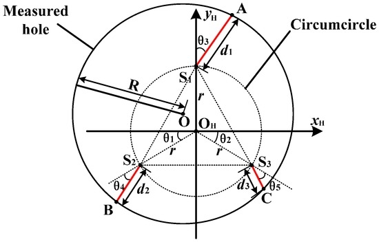 The measurement model of the inner diameter is shown in Figure 3. O is the center of the measured hole. S1, S2, S3 are the emitting points of the measuring lasers. A, B, C are the measured points. To establish the relationship between the measured diameter (assumed as R) and the measuring head, the coordinate system xH-oH-yH is introduced, where OH is the center of the circumcircle of triangle S1S2S3 and S1 is on the positive yH axis. Then, A(x1, y1), B(x2, y2), C(x3, y3) can be expressed as: