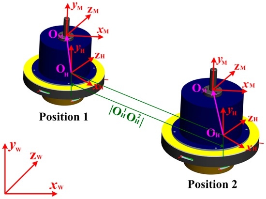 As analyzed above, the position relationship between the measuring head and the hole–center distance can be obtained by Equation (7). To measure the hole–center distance, generally speaking, the relative position between the measuring head and the NC machine tools should also be formulated. To clarify this, the coordinate system xM-yM-zM is introduced as the coordinate system of NC machines (CSNC). The coordinate system xH-yH-zH is defined as the coordinate system of the measuring head (CSMH). Then xW-yW-zW is the world coordinate system (WCS). As shown in Figure 4, when the measuring head is moved by the motion mechanism of NC machines, the relationship between CSNC and CSMH remains the same. Assume that