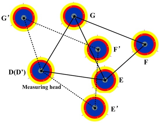 The deductions above offer some necessary information about measuring distances. Nevertheless, no deductions about measuring angles have been obtained yet. As a result, it is difficult to calculate the hole–center distance simply by the two deductions above. For example, as shown in Figure 5, the shape of quadrangle DEFG is not fixed if we merely give the lengths of its four sides (|DE|, |EF|, |FG|, and |GD|). However, the quadrangle’s shape will be fixed under an extra condition that the length of |EG| is given. Under this condition, |DF| can be calculated by