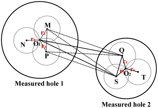 Based on Deduction 1, |O1M|, |O1N|, |O1P|, |O2Q|, |O2S| and |O2T| are known quantities. Based on Deduction 2, |MP|, |MQ|, |PQ|, |MS|, |PS|, and |QS| are also known quantities. As a result, the hole–center distance |O1O2| can be calculated from Equation (17). The contribution of this measurement model is that the measuring head does not need in-situ calibration and the inspection process can be immediately carried out as long as the head is installed onto the NC machines.