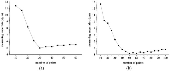 As in the analysis in Section 3.1, the intrinsic parameters can be calibrated by Equation (4). As the number of the intrinsic parameters is six, we need at least six groups of measurements ({d1i, d2i, d3i}). By changing the relative position between the measuring head and measured hole, plenty of groups of measurements ({d1i, d2i, d3i}) can be acquired. To clarify the influence of the group number i on the measurement results, the simulation is performed as shown in Figure 7. In the simulation analysis, the errors of the measurements ({d1i, d2i, d3i}) are assumed as 0.1%. The relative positions are chosen randomly. Two inner diameters of 150 mm and 275 mm are taken as examples. From Figure 7 we can see that, the measurement uncertainty firstly decreases as the number of points increases. The reason for this is that the measurement accuracy improves with increasing the measurement information. Then, the measurement uncertainty increases as the number of points sequentially increases. The reason is understandable as the errors of measurements ({d1i, d2i, d3i}) reduce the final accuracy. In Figure 7a, the measurement uncertainty reaches the minimum value when i is approximately 30. In Figure 7b, the measurement result contains the least error when i is about 50. From the simulation we can know that i should be chosen as 30 while measuring the 150 mm diameter whereas i should be given as 50 when measuring the 275 mm diameter.