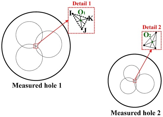 As discussed in Section 3.2, the measured hole–center distance is the common point of the three circles. In practice, the three circles may not have any common point because of the measurement errors of the head and the coordinate errors caused by NC machines. As shown in Figure 8, the common point in theory may be converted into the crossed regions as shown by Details 1 and 2. Since the crossed regions are really small, their shapes can be deemed as triangles. In this case, the measured hole–center distance is regarded as the barycentric coordinate of the triangle. For example, the barycenter of triangle IJK in Detail 1 can be expressed as: