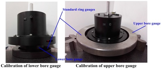As shown in Figure 9, the intrinsic parameters are calibrated by using standard ring gauges. The inner diameter of the small ring gauge is 150 mm and the inner diameter of the big ring gauge is 275 mm. The data samples for calibrating the lower bore gauge are collected at 30 measuring positions. The data samples for calibrating the upper bore gauge are gathered at 50 measuring positions. The intrinsic parameters (the definition was given behind Equation (1)) are finally shown in Table 1. The estimated values of the intrinsic parameters can be calculated through the JADE algorithm [22]. The JADE algorithm, proposed by Zhang and Sanderson, is successfully applied to solve numerous optimization problems in diverse fields. It offers great flexibility, robustness and precision with respect to various types of functions. JADE is a mature algorithm and its application detail can refer to [22].