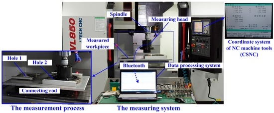 Two measuring strategies are adopted according to diverse accuracy requirements. For position parameters, whose accuracy requirement is generally low, the position accuracy of NC machines is high enough to deal with this situation [21]. Hence, the coordinate system of NC machines can be employed to measure the position parameters. For dimension parameters, the machining requirement is usually extremely strict. In this case, NC machines are used just for delivery and transportation, and their coordinates have no impact on the measurement results. Note that the developed measuring head is capable of measuring inner diameters independently. Its measuring accuracy can sufficiently meet the exact demand.