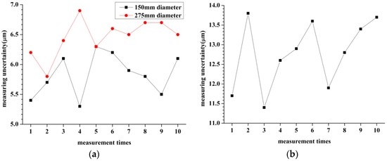 Note that each time when the measuring head is installed onto the spindle of NC machines, the installation pose cannot be the same. To test the influence of the head’s installation on the measurement results, the head is installed and uninstalled to measure the critical parameters 10 times. The measurement results are shown in Figure 11. From Figure 11a, it can be seen that the measurement uncertainties are all within 10 μm. These data show that the installation parameters do not have obvious effects on the measurements of the inner diameters. It should also be found from Figure 11b that the installation pose does not have a clear relationship with the measurement accuracy.