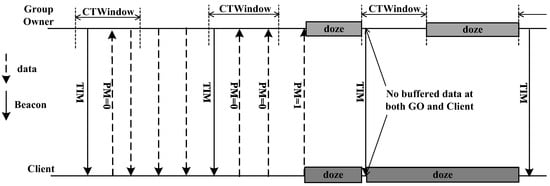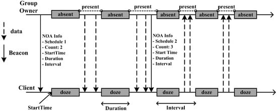 Devices connected to the Wi-Fi Direct are classified into the group of owner (GO) and the client. The GO functions as an access point (AP) in an existing Wi-Fi network, while the clients are connected through the GO. Clients can communicate only via the GO, either one-to-one or one to N []. The GO consumes more energy than the clients, as it has to perform certain functions such as beaconing and forwarding []. While research on the method to save the energy in terminals connected to an AP in an existing infrastructure Wi-Fi network has been conducted, there has been little research on the AP power-saving because a constant power supply is assumed for the APs. As the GO plays the role of an AP in the Wi-Fi Direct, it should be portable and is therefore limited by the battery capacity. Thus, the usage of the opportunistic method and the NoA method for power-saving in the GO has been suggested [].