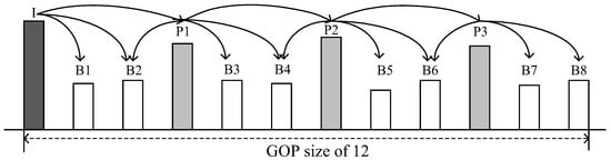 The VBR video traffic consists of three types of video frames: Intra (I), Predictive (P), and Bi-directional (B). As shown in Figure 3, the frames are arranged in pre-determined patterns from an I-frame to the next, called a group of picture (GoP) structure. The GoP structure is expressed mainly as MmNn, where n indicates the total number of frames in the GoP and m indicates the I-P or P-P-frame interval []. All the frames with the exception of the I-frame are encoded based on the dependency among the adjacent frames, while the I-frames are encoded as they are without referring to other images. P-frames are encoded with reference to the previous I-frame or P-frame, while B-frames refer to the previous and following I-frame and (or) P-frame. Thus, when an I-frame is lost, all frames in the GoP are lost. When a P-frame is lost, all of the following P- and B-frames are lost. In contrast, when a B-frame is lost, it does not affect the other frames []. To sum up, the listing of the frames in descending order according to their significance is as follows: I-frame, P-frame, and B-frame.