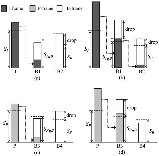 As shown in Figure 3, P-frame has the second highest priority. Thus, similar to the case of the I-frame, the remaining fraction of the P-frame not being transferred in its P-frame interval is transmitted in the following B-frame interval (-frame interval in Figure 5c). However, unlike to the case shown in Figure 5b, the proposed method does not transfer the remaining fraction of the P-frame not being accommodated in the -frame interval to the next B-frame interval (-frame interval in Figure 5d), but insists on it being dropped.