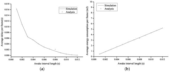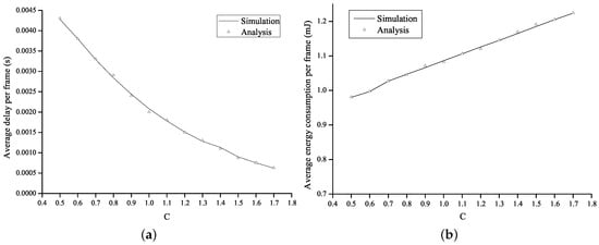 Figure 6 shows the average energy consumption per frame and the average delay per frame as a function of the value of c in the proposed method. The operational parameter c is set to range from to . Figure 6a shows that, as c increases, the awake interval is extended so that the number of the frame transmission failure decreases. As a result, the average delay is shortened. However, as the awake interval is extended in proportion to the value of c, more energy was consumed, as shown in Figure 6b.