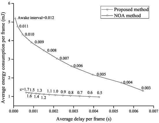 In Figure 8, the performance of the proposed method is directly compared to that of the NoA method in terms of the average delay per frame and the average energy consumption per frame. Every point on each curve can be obtained by varying the value of c in the proposed method or by varying the length of the awake interval in the NoA method. The energy-delay trade-off relation is shown in both of the methods, and the energy consumption decreases as the average delay increases. It is noticed that the inner curve shows better tradeoff performances, i.e., both the energy consumption and the delay are smaller than those of the outer curve. The outer curve is given by the NoA method, and the inner curve is given by the proposed method. This implies that the proposed method enhances the overall performance and shows better performance than the NoA method.