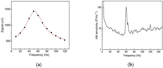 Figure 4d illustrates the sensitivity in 0–400 Hz; beyond this range, the sensitivity coefficient gradually increases by 20%, reaching a plateau at 2 kHz. We expect a sensitivity of 10 fT/Hz