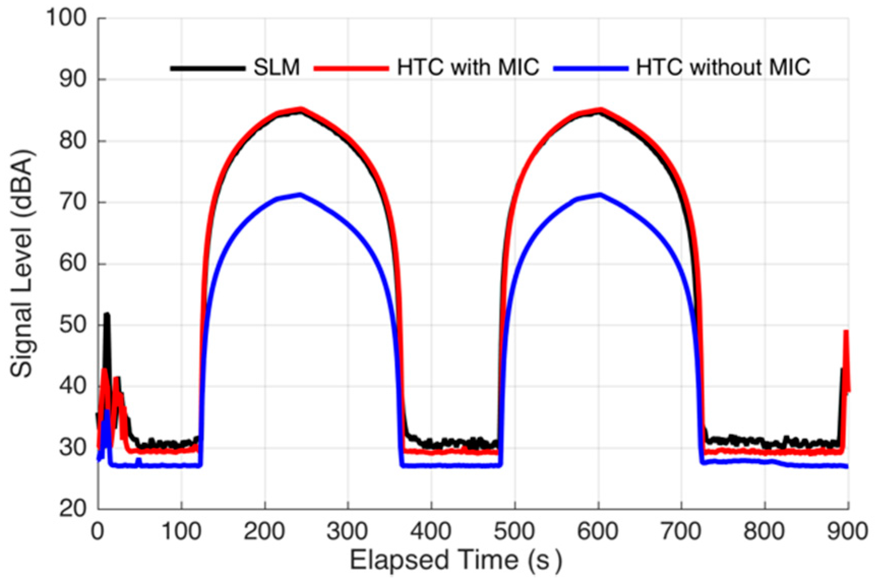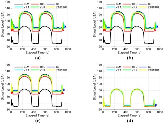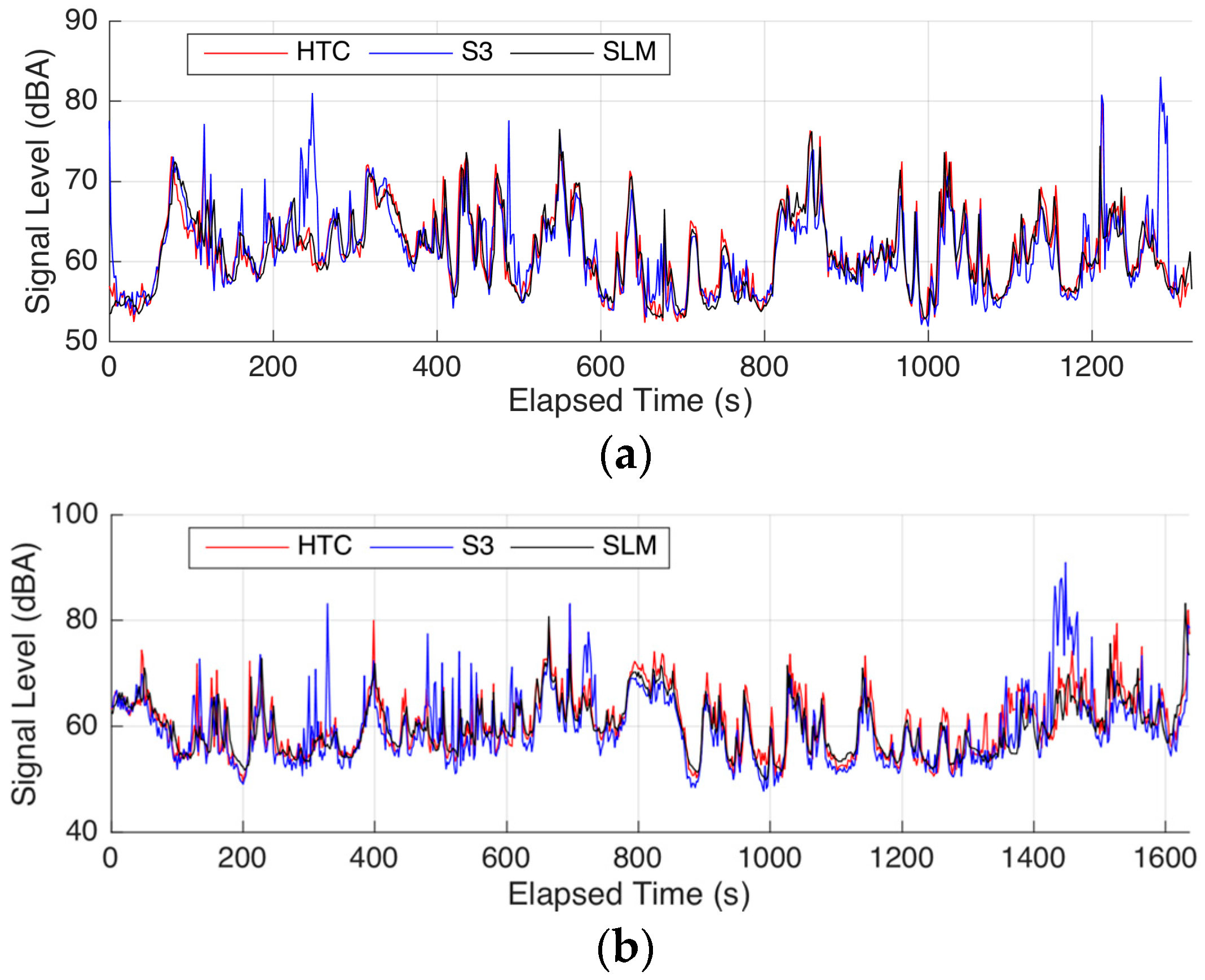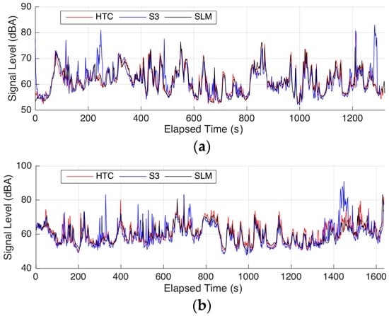 Figure 8a shows that the time series of the sound level from the HTC with an additional microphone (red line) is highly similar to that from the SLM when the volunteer was walking. The time series of the sound level from S3 with built-in microphone shows some unexpected fluctuations compared with that from the SLM. The correlation coefficient between the former two conditions was 0.8437, whereas that of the latter was 0.6894.