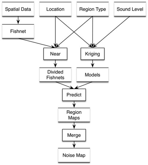 Several interpolation methods are available, such as the linear, nearest neighbour, and Kriging methods []; however, these interpolation methods do not take into account the influence of spatial heterogeneity on the interpolation results. A large difference in the value of the property between different sub-regions may exist; thus, the property values of two adjacent points are also different. Therefore, we design a noise-mapping method called region-based noise-mapping method (RNMM), which is based on the noise distribution of different regional types tagged by volunteers to model, interpolate, and combine these noise distributions to reduce the influence of spatial heterogeneity and improve the noise-mapping precision, as shown in Figure 3.