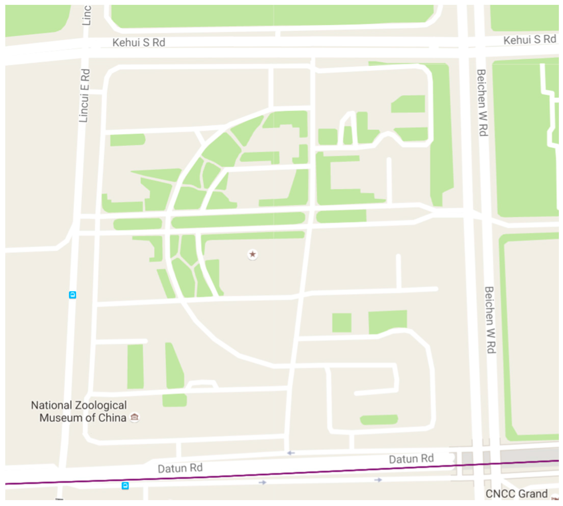 We choose an approximately 500 m × 500 m park in Beijing as our experimental field. The main plots and road distributions are shown in Figure 6 and described as follows: