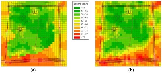 Noise maps of the experimental field during the peak hour (8:00–9:00) obtained by different methods: (a) RNMM and (b) Kriging.