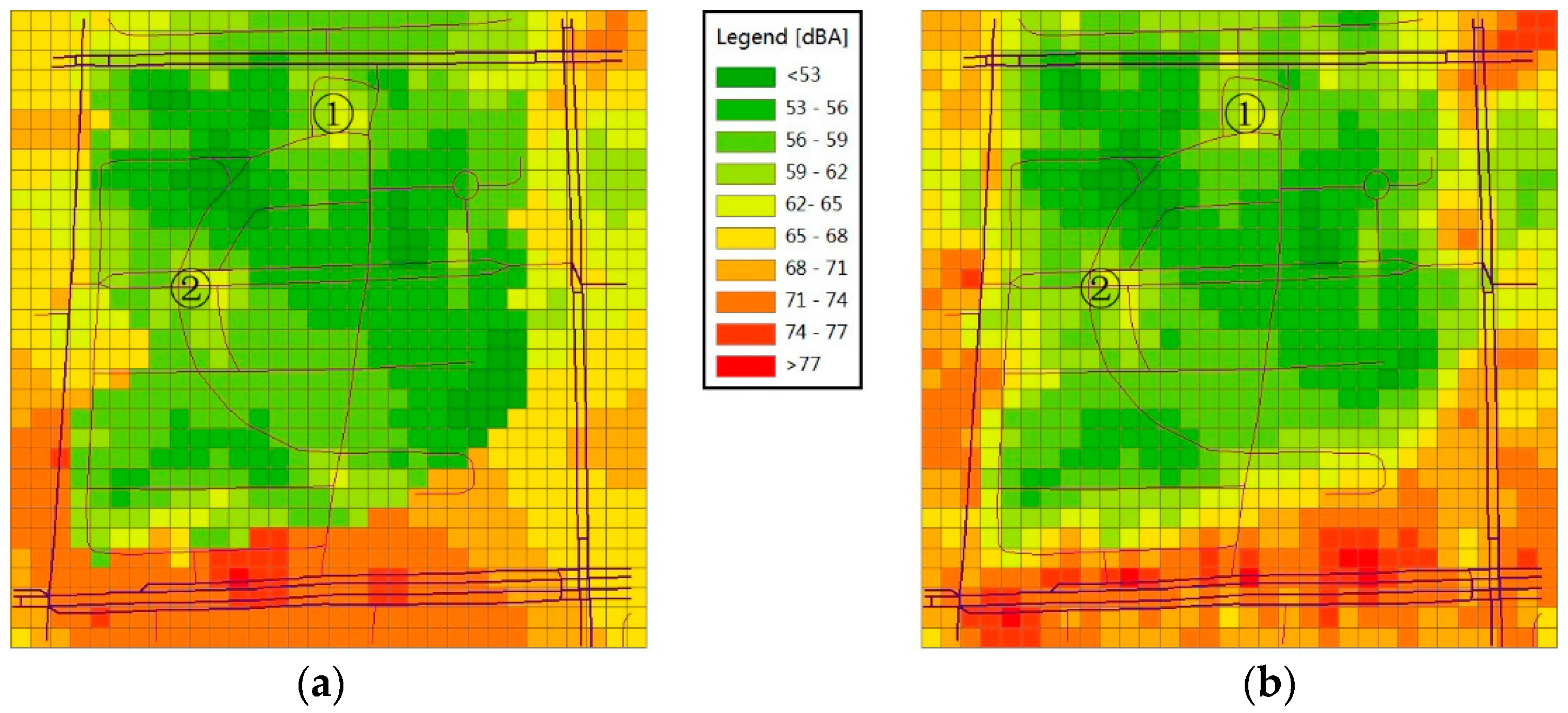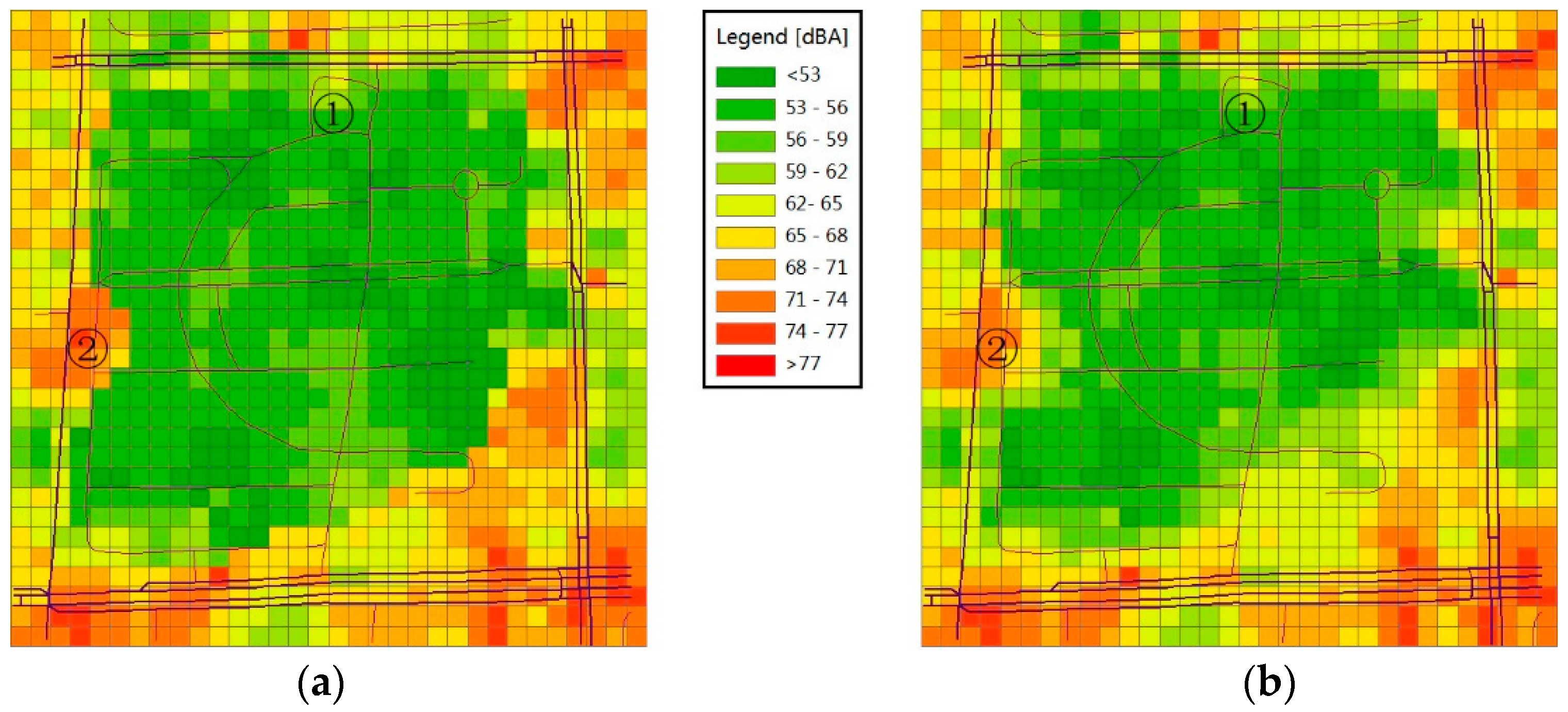 The results for the peak and off-peak hours are shown in Figure 9 and Figure 10, respectively, where (a) uses the RNMM and (b) uses the Kriging method. By visual comparison of the two maps shown in Figure 9, we can see that the noise distribution of the two corresponds to the actual situation. The main road in the south shows higher sound levels, especially the crossroads in the southeast followed by the roads around the park. The sound levels in the area near the road tend to be higher than those far from the road. Most parts of the park display low sound levels except the area in the north (marked by ①) and that west of the central part (marked by ②). In the former, we believe that these higher values are partly due to the north exit of the park and the operation of large exhaust fans attached to a nearby dining hall. In the latter, we attribute the higher noise level to the intersection in the park where the crowd and vehicles generate loud noise.