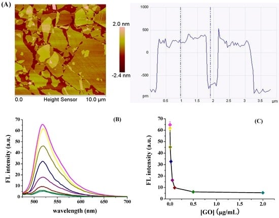 (A) AFM image and lateral size of GO; (B) Fluorescence spectra of 50 nM FITC-PPLRINRHILTR in the presence of different concentrations of GO; (C) Fluorescence intensity of FITC-PPLRINRHILTR versus the concentration of GO.