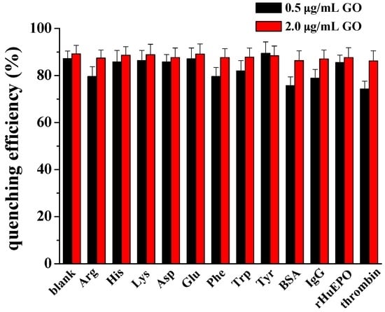 Some amino acids and proteins may also show the electrostatic and π–π interactions with GO. This maybe has a negative effect on the interaction of FITC-PPLRINRHILTR and GO. For this view, we studied the impact of hydrophilic or aromatic amino acids (Arg, His, Lys, Asp, Glu, Phe, Trp and Tyr) and proteins (BSA, IgG, rHuEPO and thrombin) on the quenching efficiency of GO to FITC-PPLRINRHILTR (Figure 2). Consequently, we found that Lys, His, Glu and Asp showed negligible effects on the quenching efficiency. However, the presence of Arg, Phe, Trp, Tyr and the four tested proteins weakened the interaction of GO to FITC-PPLRINRHILTR, thus decreasing the quenching efficiency in different degree. The use of excess concentrations of GO may reduce the interference of some matrix components existing in biological samples. Herein, we found that the fluorescence of FITC-PPLRINRHILTR could be quenched effectively by a high concentration of GO even in the presence of these tested interferences. Thus, in the following detection assays, GO at an excess concentration of 2 μg/mL was used for the detection assay.