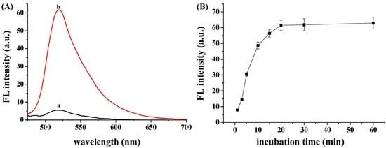 (A) Fluorescence spectra of FITC-PPLRINRHILTR/GO in the absence (curve a) and presence (curve b) of hCG. The concentrations of FITC-PPLRINRHILTR and hCG were 50 nM and 50 IU/mL, respectively; (B) Fluorescence restoration of FITC-PPLRINRHILTR/GO by hCG as a function of time.