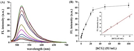 (A) Fluorescence spectra of FITC-PPLRINRHILTR/GO in the presence of different concentrations of hCG; (B) Dependence of fluorescence intensity on hCG concentration. The inset shows the linear segment in the range of 0.05 to 20 IU/mL.