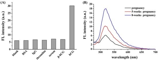 Biological fluids may contain many proteins (e.g., antibodies, proteases, glycoproteins and other common proteins). To explore the selectivity of the proposed method, three interfering proteins (BSA, IgG, thrombin) and serum sample containing FSH, LH and TSH were tested. Moreover, beta-subunit of hCG (β-hCG) is also abundant in pregnancy sample. Thus, the specificity of the aptamer to β-hCG was also investigated. As shown in Figure 5A, compared to the control, none of these interferences caused a significant increase in the fluorescence intensity, demonstrating that the established fluorescent platform showed extraordinary selectivity towards hCG. The high selectivity could be principally attributed to the strong and specific interaction between hCG and its binding peptide (KD = 0.9 nM) [2].