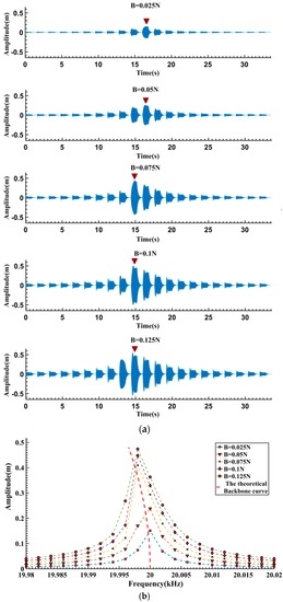 From Figure 2a, the average amplitude during 0.7–0.8 s in the forced vibration stages is calculated as the steady-state response amplitude. The obtained relationship between the excitation frequency and steady-state response amplitude is shown in Figure 2b. As a comparison, the theoretical Backbone curve of the system is plotted in the figure as well. Obviously, the obtained amplitude-frequency curves fit the theoretical Backbone curve well.